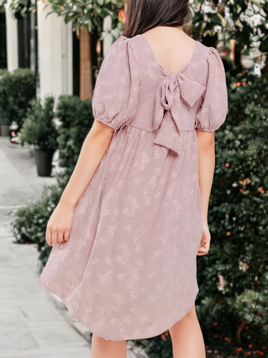 Bow Tie Back Puffed Short Sleeve Textured Flared Tunic Dress